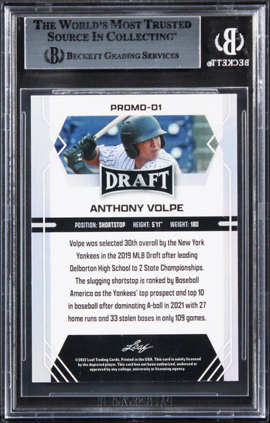 This Autographed 2022 Leaf Draft Promo #1 Rookie Card has been Personally Signed by Anthony Volpe of the New York Yankees. This item is 100% Authentic, it comes slabbed and authenticated by Beckett Authentication Services. The authenticity can be verified on Beckett Authentication Services website.