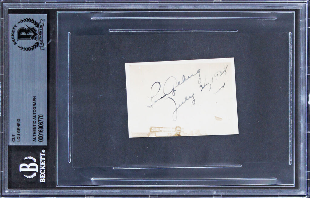 This Autographed 1.75x2.5 Cut Signature with the inscription of "July 24, 1928" has been Personally Signed by Lou Gehrig of the New York Yankees. This item is 100% Authentic, it comes slabbed and authenticated by Beckett Authentication Services. The authenticity can be verified on Beckett Authentication Services website.