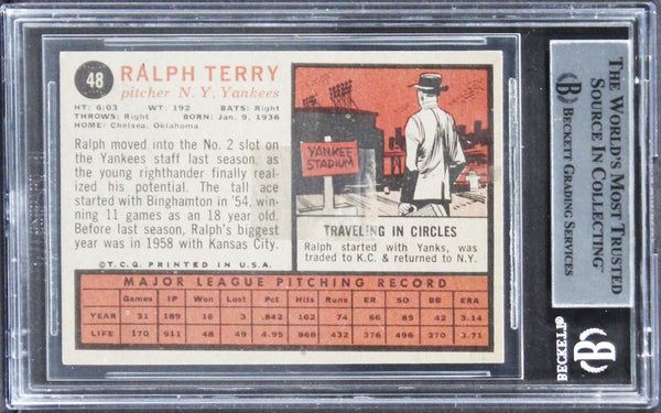 This Autographed 1962 Topps #48 Card has been Personally Signed by Ralph Terry of the New York Yankees. This item is 100% Authentic, it comes slabbed and authenticated by Beckett Authentication Services. The authenticity can be verified on Beckett Authentication Services website.