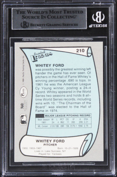 This Autographed 1989 Pacific Legends #210 Card has been Personally Signed by Whitey Ford of the New York Yankees. This item is 100% Authentic, it comes slabbed and authenticated by Beckett Authentication Services. The authenticity can be verified on Beckett Authentication Services website.
