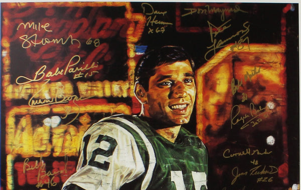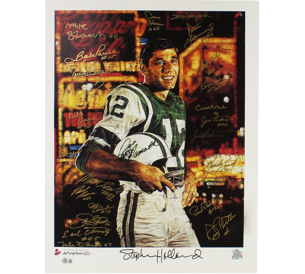 An Unframed Joe Namath Artist Proof Poster hand signed by artist Steve Holland and 25 1969 New York Jets Alumni incuding Joe Namath, Don Maynard, Babe Parilli, Matt Snell, Emerson Boozer, Bill Mathis, Pete Lammons, Bill Baird, Dave Herman, Ralph Baker, Paul Rochester, Earl Christy, Al Atkinson, Mike D'Amato, John Schmidt, Paul Crane, Jeff Richardson. The item and signatures are in excellent condition. The poster measures approximately 20"x26". AUTHENTICATION: The item is accompanied by a Beckett Letter of Authenticity - Beckett Serial Numbered and Databased Hologram.