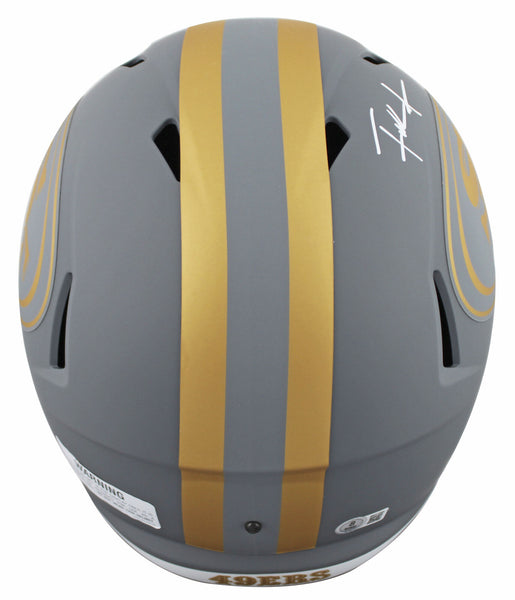 This Autographed Alternate Slate Riddell Full Size Speed Rep Helmet has been Personally Signed by Frank Gore of the San Francisco 49ers. This item is 100% Authentic to include a hologram by Beckett Authentication Services. This item will come with an affixed Beckett Authentication Services (BAS) authentication sticker, which includes a scannable QR code to verify authenticity. Please note that Beckett no longer provides serial-numbered COA cards, and the attached BAS sticker will serve as the complete authentication for this item. This is a BAS Witnessed Protection Program item which means a Beckett Authentication Service representative was present when this item was being signed. We conducted an autograph signing with Frank Gore where multiples of the same item were signed. While the photographs are representative of this item, the size, placement and strength of the signature may vary. Each item is hand signed, therefore, each autograph is unique. This item can be verified through BAS Witnessed.