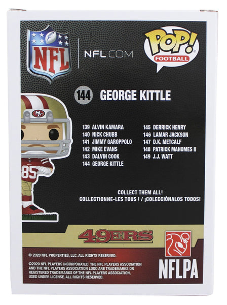 This Autographed #144 Funko Pop Vinyl Figure has been Personally Signed by George Kittle of the San Francisco 49ers. This item is 100% Authentic to include a hologram by Beckett Authentication Services. This item will come with an affixed Beckett Authentication Services (BAS) authentication sticker, which includes a scannable QR code to verify authenticity. Please note that Beckett no longer provides serial-numbered COA cards, and the attached BAS sticker will serve as the complete authentication for this item. This is a BAS Witnessed Protection Program item which means a Beckett Authentication Service representative was present when this item was being signed. We conducted an autograph signing with George Kittle where multiples of the same item were signed. While the photographs are representative of this item, the size, placement and strength of the signature may vary. Each item is hand signed, therefore, each autograph is unique. This item can be verified through BAS Witnessed. This item will ship in a Pop! Protector, please refer to the photos for condition of the item prior to purchase, these are in good condition but would not be considered mint.