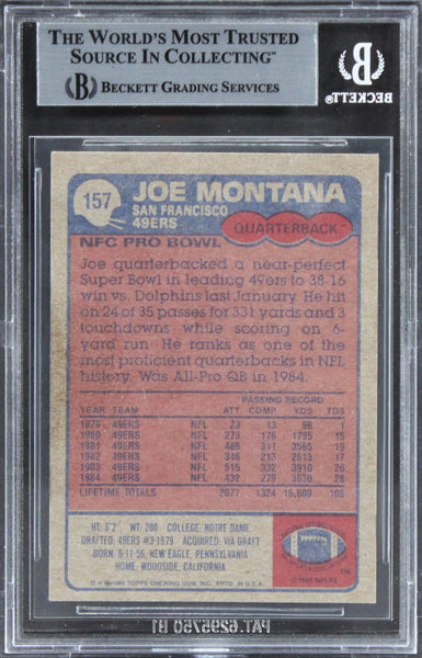 This Autographed 1985 Topps #157 Card has been Personally Signed by Joe Montana of the San Francisco 49ers. This item is 100% Authentic, it comes slabbed and authenticated by Beckett Authentication Services. The authenticity can be verified on Beckett Authentication Services website.