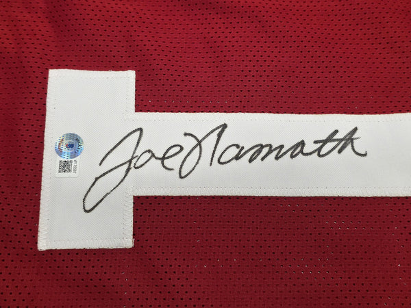 This is a Maroon Jersey that has been hand signed by Joe Namath. This is a custom jersey with no name brand. The approximate size is XL. It has nice sewn in name and numbers. This item has been witnessed and certified authentic by Beckett Authentication (BAS) and comes with their tamper-proof witness hologram.