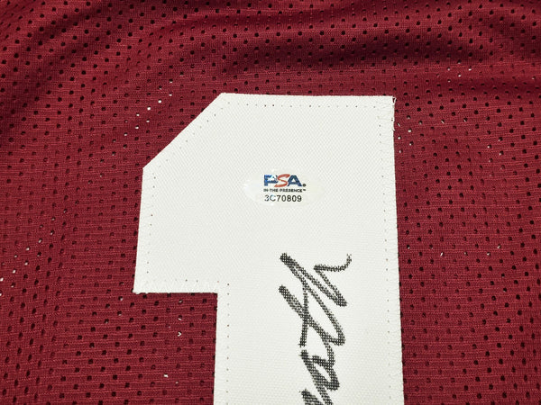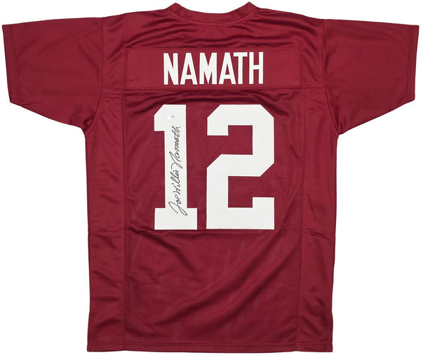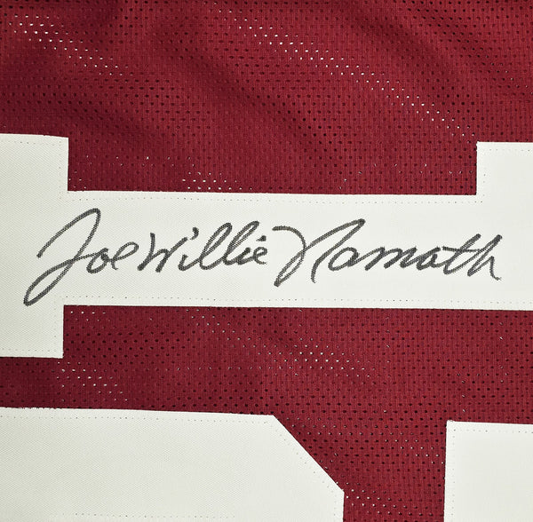 This is a Maroon Jersey that has been hand signed by Joe Namath. This is a custom jersey with no name brand. The approximate size is XL. It has nice sewn in name and numbers. This item was inscribed "Willie." This item has been witnessed and certified authentic by PSA/DNA ITP and comes with their tamper-proof hologram.