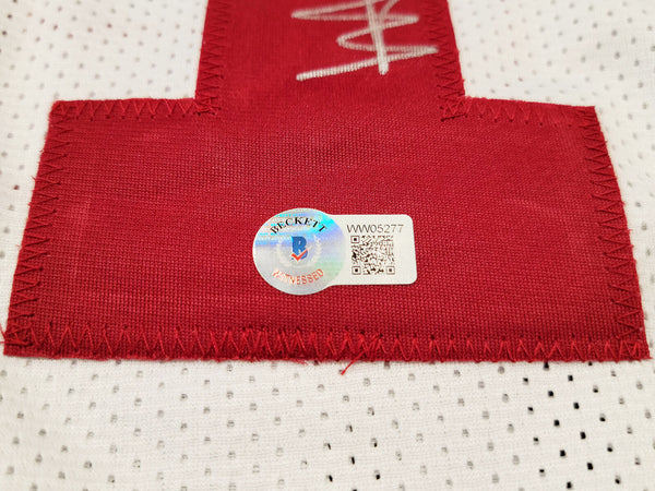 This is a White Jersey that has been hand signed by Will Anderson. This is a custom jersey with no name brand. The approximate size is XL. It has nice sewn in name and numbers. This item was inscribed "Terminator." This item has been certified authentic by Beckett Authentication (BAS) and comes with their tamper-proof QR Code sticker that can be verified on the Beckett-authentication.com.