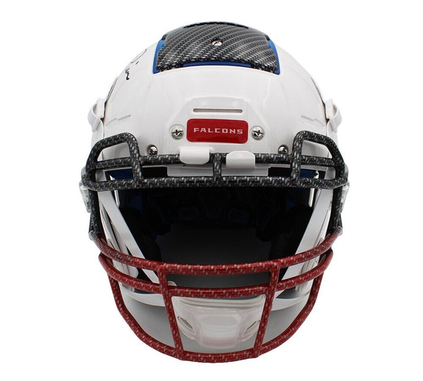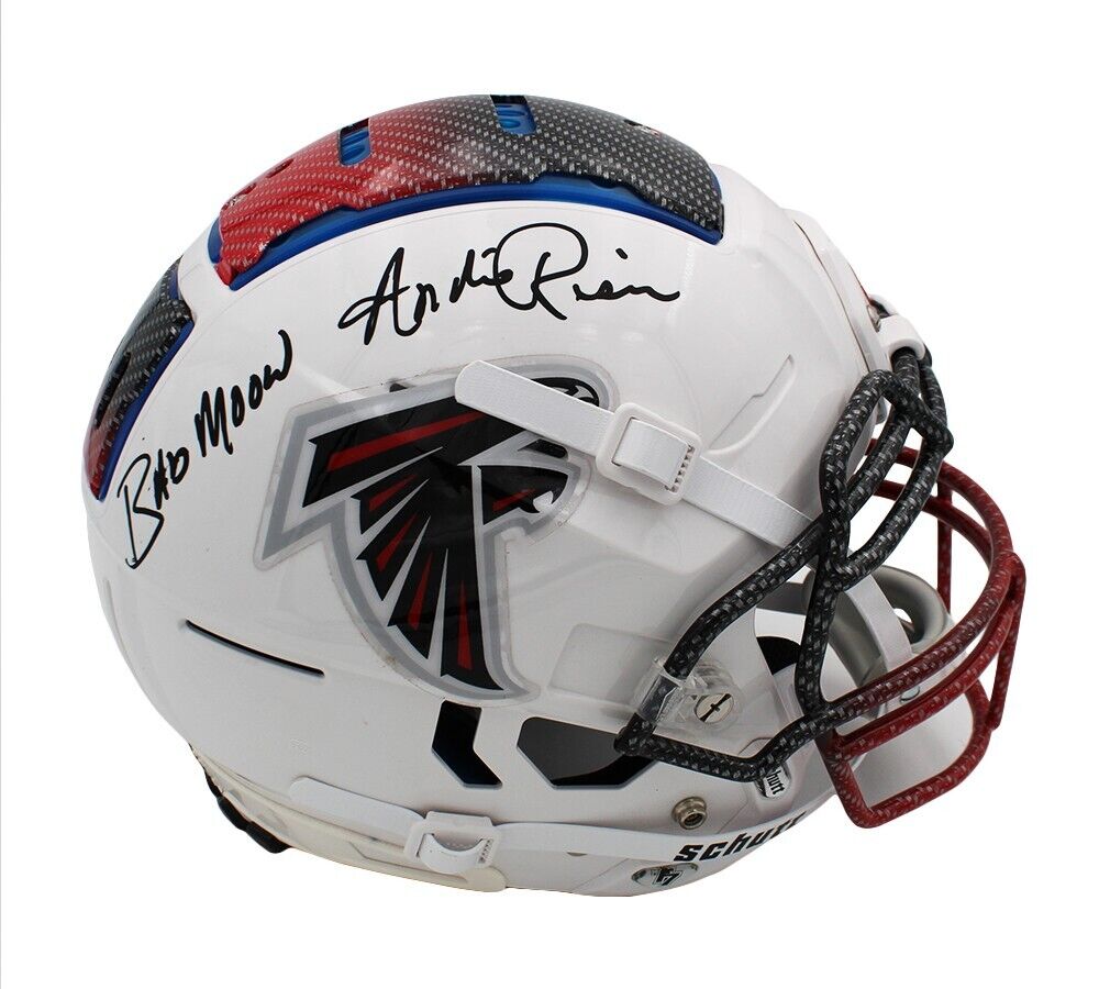 An Atlanta Falcons Schutt F7 Authentic Custom NFL Helmet hand signed by Andre Rison. The item and signature are in excellent condition. In addition to signing his name, Andre inscribed "Bad Moon" on the item. Andre Rison is a former NFL wide receiver known for his explosive playmaking ability and colorful personality. A standout at Michigan State, Rison was drafted by the Indianapolis Colts in the first round of the 1989 NFL Draft. Over his 12-season career, he played for several teams, including the Atlanta Falcons, Kansas City Chiefs, and Green Bay Packers. Rison was a key contributor to the Falcons' offense during their run to Super Bowl XXXIII and earned multiple Pro Bowl selections. AUTHENTICATION: The item is accompanied by a Beckett Serial Numbered and Databased Hologram.