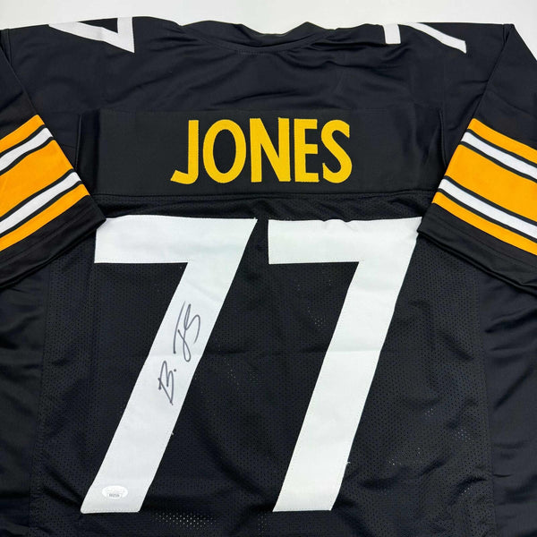 Autographed/Signed Broderick Jones Pittsburgh Black Football Jersey JSA COA Jersey has no brand names or logos. This is a custom jersey and was not manufactured by or in any manner associated with any professional sports league or manufacturer. This custom jersey carries no professional sports league designation. The item is intended to be an autographed collectible. The custom jersey displays the name and number of the player. This item in no way is affiliated with or connected to any professional sports organization. Size is XL.