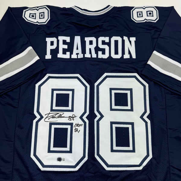 Autographed/Signed Drew Pearson Dallas Navy Football Jersey Beckett BAS COA Jersey has no brand names or logos. This is a custom jersey and was not manufactured by or in any manner associated with any professional sports league or manufacturer. This custom jersey carries no professional sports league designation. The item is intended to be an autographed collectible. The custom jersey displays the name and number of the player. This item in no way is affiliated with or connected to any professional sports organization. Size is XL