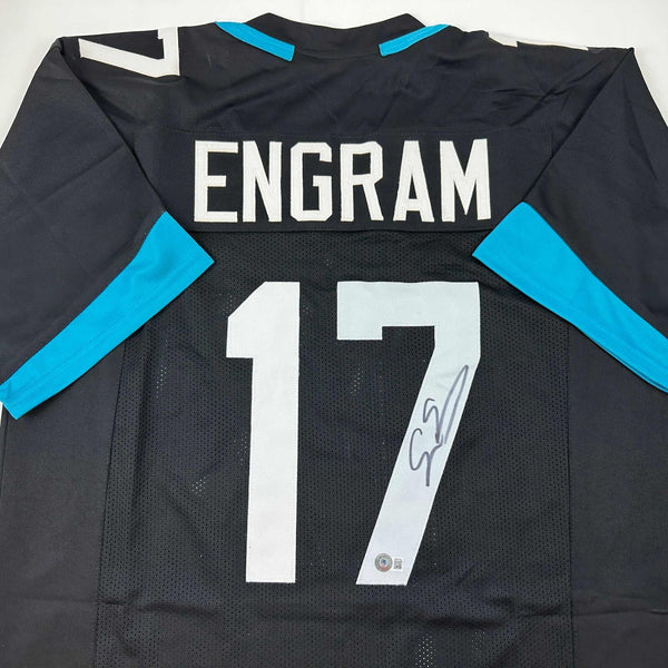 Autographed/Signed Evan Engram Jacksonville Black Jersey Beckett BAS COA Jersey has no brand names or logos. This is a custom jersey and was not manufactured by or in any manner associated with any professional sports league or manufacturer. This custom jersey carries no professional sports league designation. The item is intended to be an autographed collectible. The custom jersey displays the name and number of the player. This item in no way is affiliated with or connected to any professional sports organization. Size is XL.