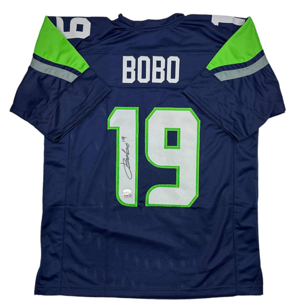 Autographed/Signed Jake Bobo Seattle Blue Football Jersey JSA COA Jersey has no brand names or logos. This is a custom jersey and was not manufactured by or in any manner associated with any professional sports league or manufacturer. This custom jersey carries no professional sports league designation. The item is intended to be an autographed collectible. The custom jersey displays the name and number of the player. This item in no way is affiliated with or connected to any professional sports organization. Size is XL.