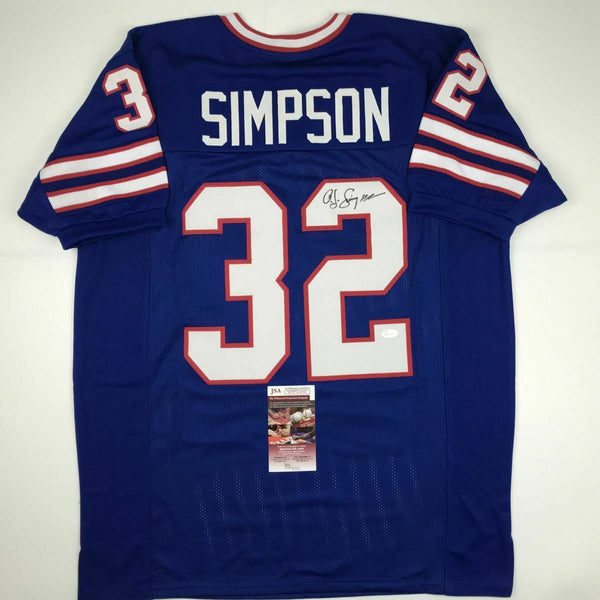 Autographed/Signed OJ O.J. SIMPSON Buffalo Blue Football Jersey JSA COA Auto This is a custom jersey and was not manufactured by or in any manner associated with any professional sports league or manufacturer. This custom jersey carries no professional sports league designation. The item is intended to be an autographed collectible. Reference of team in the title is to allow the purchaser a point of association. The custom jersey displays the name, number and authenticated signature of the player. This item in no way is affiliated with or connected to any professional sports organization. The autograph, as always is guaranteed to be authentic and has been certified as authentic by a third-party, trusted authenticator. Size is XL unless otherwise noted.
