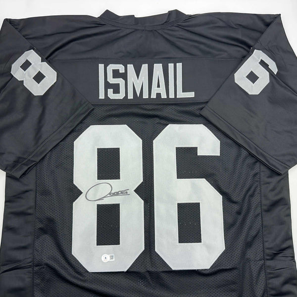 Autographed/Signed Raghib Ismail Rocket Oakland Black Football Jersey Beckett BA Jersey has no brand names or logos. This is a custom jersey and was not manufactured by or in any manner associated with any professional sports league or manufacturer. This custom jersey carries no professional sports league designation. The item is intended to be an autographed collectible. The custom jersey displays the name and number of the player. This item in no way is affiliated with or connected to any professional sports organization. Size is XL.