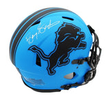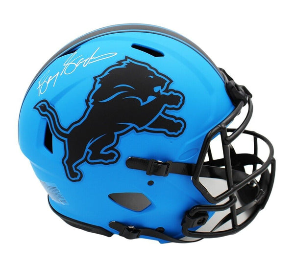 A Detroit Lions Speed Authentic Rave NFL Helmet hand signed by Barry Sanders. The item and signature are in excellent condition. Barry Sanders is a former professional American football player, widely regarded as one of the greatest running backs in NFL history. He played for the Detroit Lions from 1989 to 1998. Sanders rushed for over 15,000 yards in his career and earned 10 Pro Bowl selections. Sanders was inducted into the Pro Football Hall of Fame in 2004. AUTHENTICATION: The item is accompanied by a Schwartz Certificate of Authenticity - Schwartz Serial Numbered & Databased Hologram