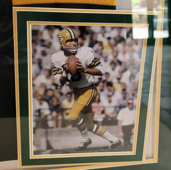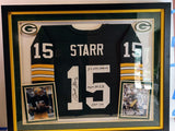 Bart Starr 5X NFL Champion Autographed Jersey Own a piece of NFL history with this autographed Bart Starr jersey featuring multiple championship inscriptions. This deluxe framed Packers jersey celebrates one of football's greatest quarterbacks and leaders. Championship Inscriptions: "5X NFL Champion" - Five NFL championships with Green Bay "MVP I, II" - Super Bowl I and II Most Valuable Player "HOF '77" - Pro Football Hall of Fame inductee What Makes This Special: JSA Certificate of Authenticity - Guaranteed authentic signature Deluxe Framing - Museum-quality 36"W x 34"H presentation Multi-Inscribed - Three key career achievements inscribed NFL Legend - From the Packers' championship dynasty era Perfect for any football fan or collector, this jersey celebrates Starr's five NFL championships, MVP awards, and Hall of Fame induction. A must-have addition to any collection!