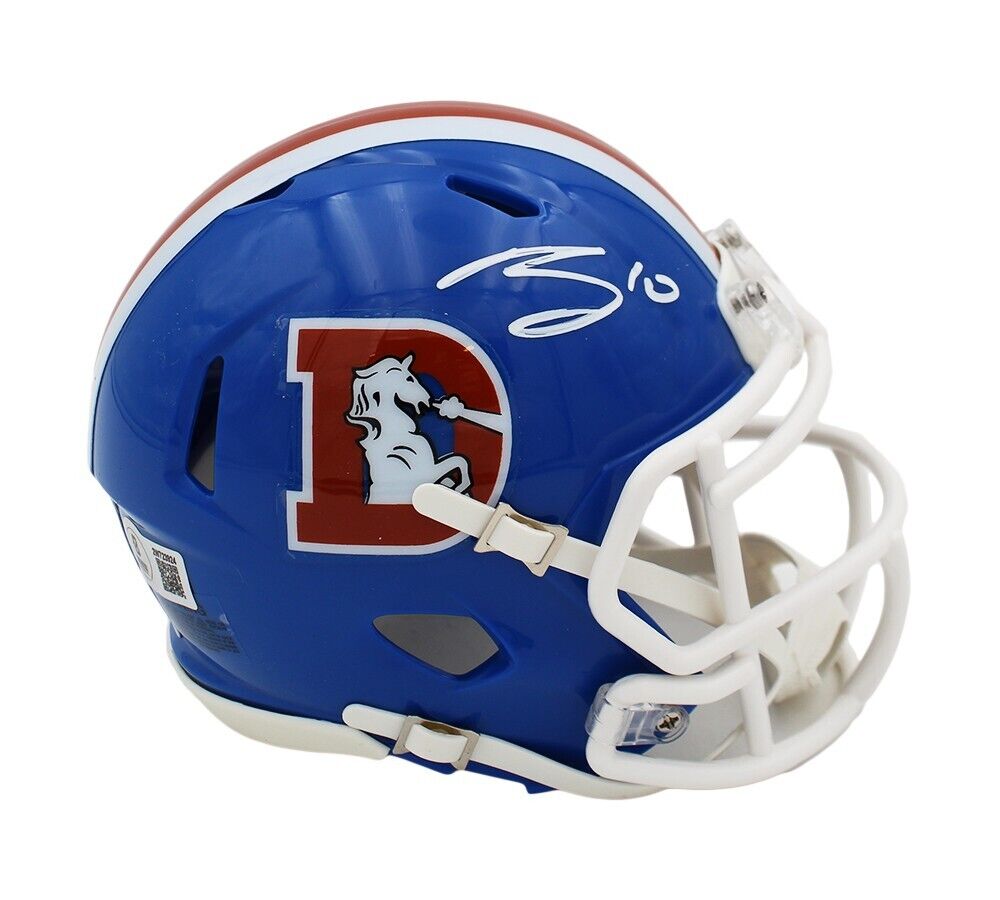 A Denver Broncos Speed Throwback Blue NFL Mini Helmet hand signed by Bo Nix. The item and signature are in excellent condition. Bo Nix is an American quarterback in the NFL. After a standout senior season for the Oregon Ducks, Bo was selected 12th overall in the 2024 NFL Draft. AUTHENTICATION: The item is accompanied by a Beckett Serial Numbered and Databased Hologram.