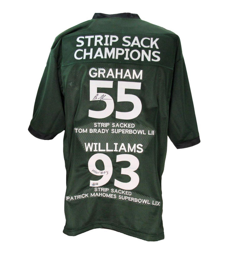 Brandon Graham/Milton Williams Dual-Signed/Autographed Green Strip Sack Champions Custom Football Jersey Philadelphia Eagles Size XL. This jersey is authenticated by BAS/Beckett Witness and includes their Tamper-proof Hologram Sticker.