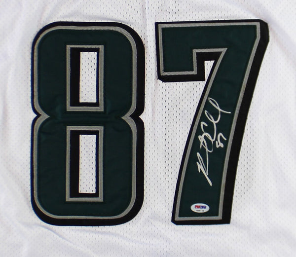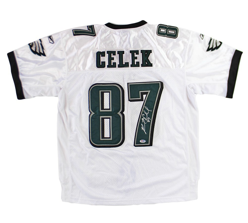 A Philadelphia Eagles Reebok Authentic White NFL Jersey hand signed by Brent Celek. The item and signature are in excellent condition. Brent Celek played tight end his entire 11-season NFL career withe the Philadelphia Eagles amassing 398 receptions for 4,998 yards and 31 touchdowns. He was instrumental in the Eagles Super Bowl LII victory, holding the franchise record for most receptions in a playoff game by a tight end, totaling 10 catches in the 2088 NFC Championship Game. AUTHENTICATION: The item is accompanied by a MAB Celebrity & PSA Serial Numbered and Databased Hologram.