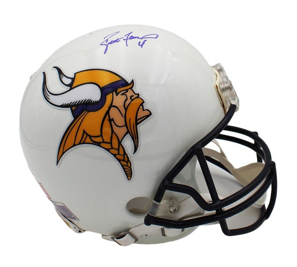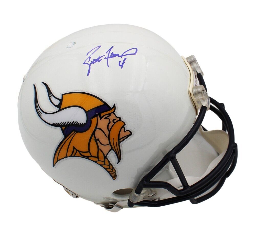 A Minnesota Vikings Authentic Custom White NFL Helmet hand signed by Brett Favre. The item and signature are in excellent condition. Brett is one of the most iconic players in NFL history. A 20 year veteran of the NFL, Brett is a Super Bowl Champion, 11x Pro Bowler, 3x AP NFL Most Valuable Player, 4x NFL passing touchdowns leader, and 2x passing yards leader. His number, 4, has been retired by both the Green Bay Packers and the Southern Miss Golden Eagles. Brett was inducted into the Pro Football Hall of Fame in 2016. AUTHENTICATION: The item is accompanied by a Brett Favre Exclusive Certificate of Authenticity, Brett Favre Exclusive Serial Numbered and Databased Hologram,-Picture of Brett from the Signing -