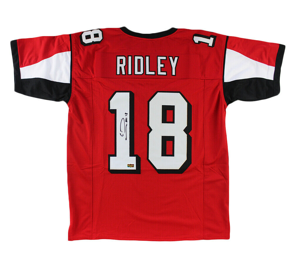 An Atlanta Custom Red Jersey hand signed by Calvin Ridley. The item and signature are in excellent condition. Calvin is a wide receiver for the Atlanta Falcons. He played college football at Alabama and was drafted by the Falcons in the first round of the 2018 NFL Draft. He is a First-team All-SEC (2017), Second-team All-SEC (2016), 2x CFP National Champion (2015, 2017), 2x SEC Champion (2015, 2016), and USA Today Freshman All-America (2015) - AUTHENTICATION: The item is accompanied by a Certificate of Authenticity - Serial Numbered and Databased Hologram