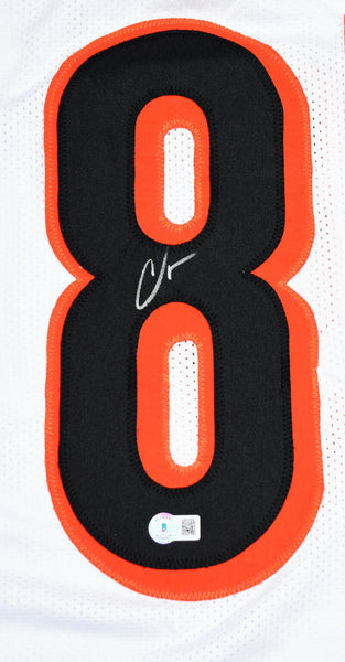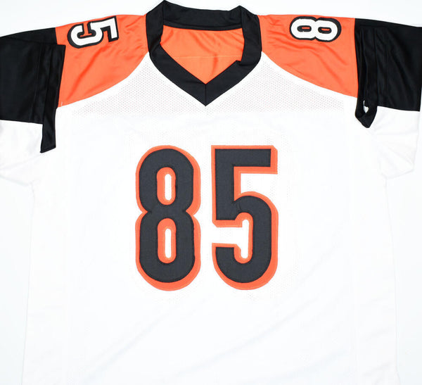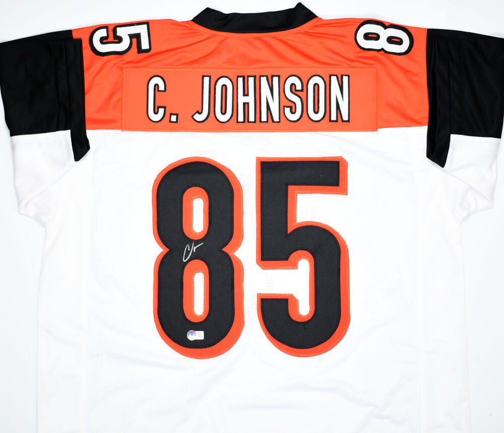 Chad Johnson Autographed White Pro Style Jersey - Beckett W Hologram *Silver *8 THIS IS NOT AN NFL JERSEY. THIS HAS NO TAGS, NO LOGOS, NO EMBLEMS. This is a hand autograph of Chad Johnson on a Custom Made (non name brand) Authentic Style Jersey with stitched letters and numbers. This item has a Beckett Witnessed Authentication, which comes with a numbered hologram and a QR code for verification. You can view this item on the Beckett website. It was signed either at a public autograph appearance or a private signing. This is a stock photo of the item. Although you may not receive this exact item, the item you receive is virtually identical and brand new in great shape. Jersey size is XL.