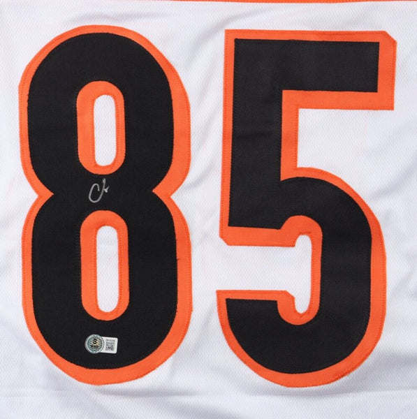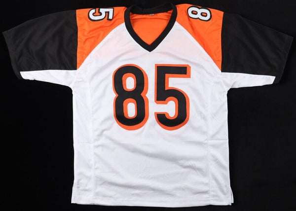 Custom on-field style jersey. Everything is sewn on, size XL. Hand-signed in black felt-tip pen by Chad Johnson. The autograph includes an official Beckett Authentication Services serially-numbered hologram and QR Code Card for authenticity purposes. The signing of this item was witnessed by Beckett.