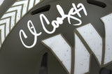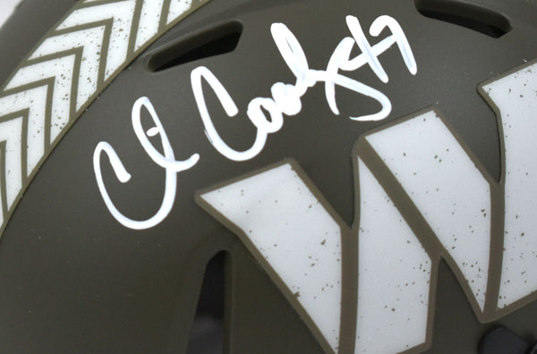 This is a Chris Cooley of the Washington Commanders hand autographed Riddell Football Salute to Service Speed Mini Helmet. It has a Beckett Witnessed Authentication, which comes with a numbered hologram and a QR code for verification. You can view this item on the Beckett Authentication website and it shows when and where the item was signed. It was signed either at a public autograph appearance or a private signing. This is a stock photo of the item. Although you may not receive this exact item, the item you receive is virtually identical, brand new, and in great shape. This is a Chris Cooley of the Washington Commanders hand autographed Riddell Football Salute to Service Speed Mini Helmet. It has a Beckett Witnessed Authentication, which comes with a numbered hologram and a QR code for verification. You can view this item on the Beckett Authentication website and it shows when and where the item was signed. It was signed either at a public autograph appearance or a private signing. This is a stock photo of the item. Although you may not receive this exact item, the item you receive is virtually identical, brand new, and in great shape.