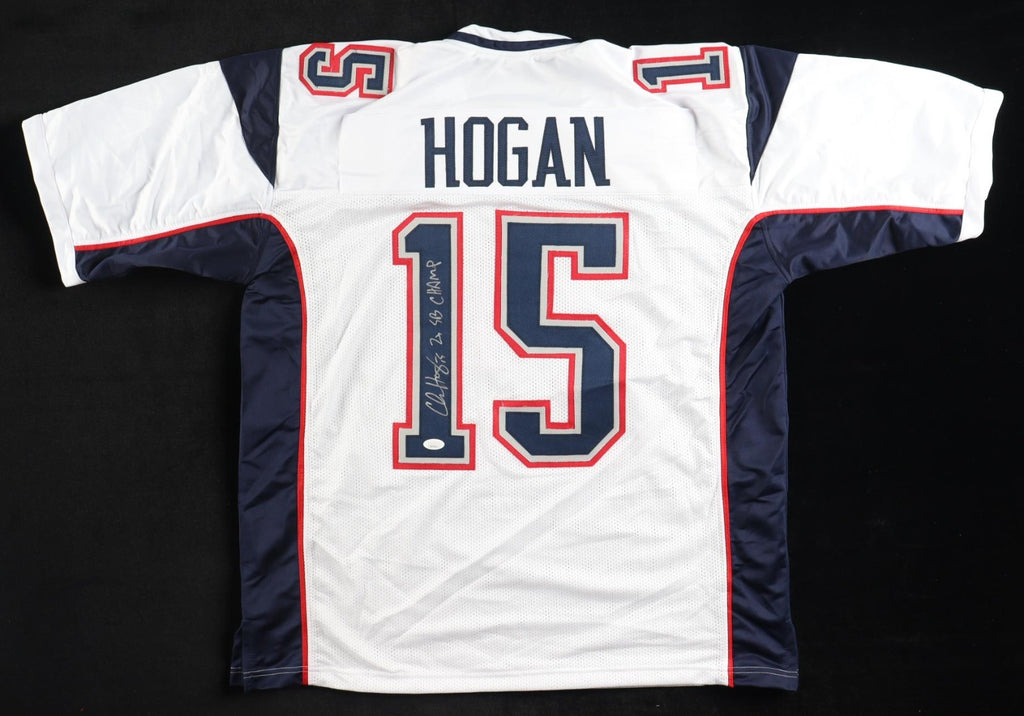 Custom on-field style jersey, everything is sewn on, size XL. Hand-signed and inscribed by Chris Hogan.The autograph(s) includes an official James Spence Authentication (JSA) hologram and scannable QR Code card for authenticity purposes. The signing of this item was witnessed by JSA.Authentication: JSA Hologram with Scannable QR Code card
