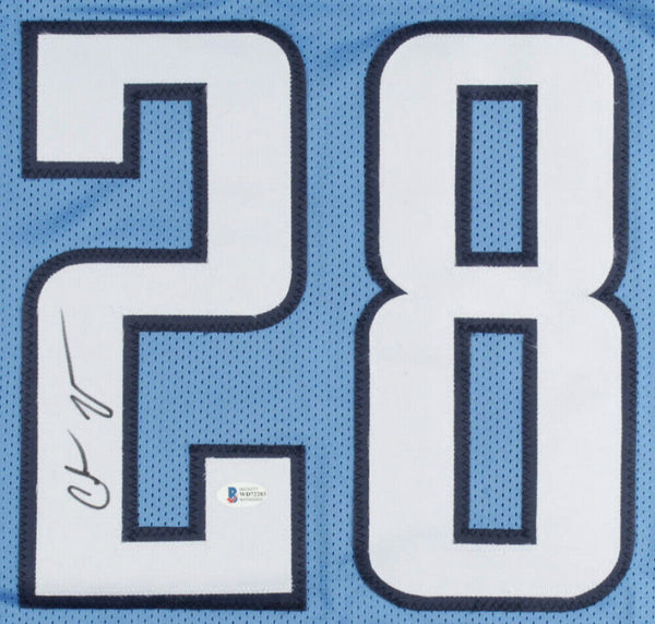 Custom on-field style jersey. Everything is sewn on, size XL. Has been hand-signed by Chris Johnson.The lot / autograph(s) includes an official Beckett Authentication Services serially-numbered hologram and matching COA for authenticity purposes. The signing of this item was witnessed by Beckett.Authentication: Beckett COA