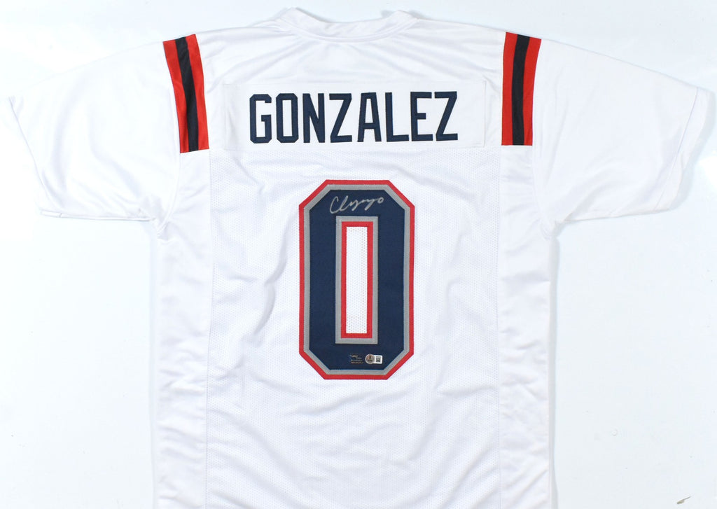 THIS IS NOT AN NFL JERSEY. THIS HAS NO TAGS, NO LOGOS, NO EMBLEMS. This is a hand autograph of Christian Gonzalez of the New England Patriots on a Custom Made (non-name brand) Authentic Style Jersey with stitched letters and numbers. This item has a Beckett Witnessed Authentication, which comes with a Beckett numbered hologram and a QR Code for verification. You can view this item on the Beckett Authentication website. It was signed either at a public autograph appearance or a private signing. This is a stock photo of the item. Although you may not receive this exact item, the item you receive is virtually identical and brand new in great shape. Jersey size is XL. THIS IS NOT AN NFL JERSEY. THIS HAS NO TAGS, NO LOGOS, NO EMBLEMS. This is a hand autograph of Christian Gonzalez of the New England Patriots a Custom made (non-name brand) Authentic Style Jersey with stitched letters and numbers. This item has a Beckett Witnessed Authentication, which comes with a Beckett numbered hologram and a QR Code for verification. You can view this item on the Beckett Authentication website. It was signed either at a public autograph appearance or a private signing. This is a stock photo of the item. Although you may not receive this exact item, the item you receive is virtually identical and brand new in great shape. Jersey size is XL.