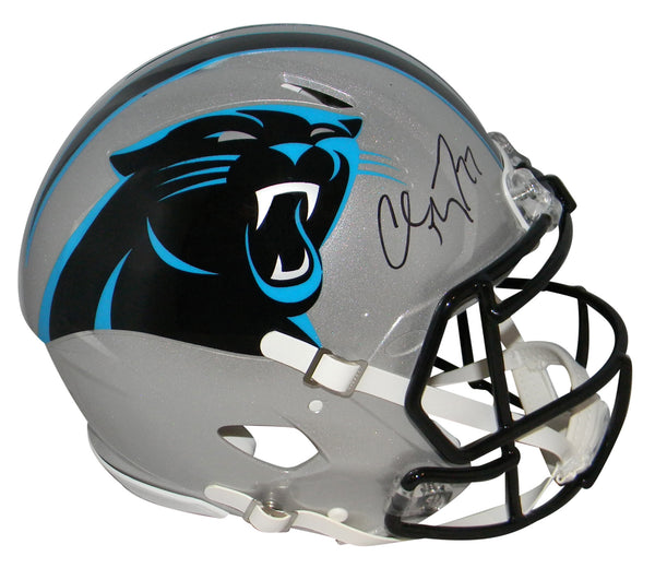 Christian McCaffrey, star running back for the Carolina Panthers, has hand signed this Panthers Riddell Speed full-size authentic helmet at a private signing. This helmet is fully padded inside like the ones worn on the field. This item comes with a certificate of authenticity (COA) from Beckett Authentication Services and was signed in the presence of one of their representatives. You will receive a serial-numbered COA along with a matching serial-numbered sticker on the helmet. The authenticity can be verified online by entering the serial number.Item pictured may not be the exact item you will receive. It will be similar quality, and we guarantee your satisfaction.