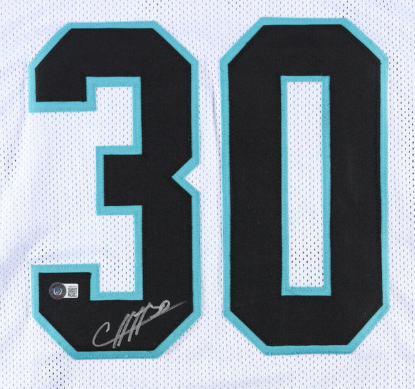 Custom on-field style jersey. Everything is sewn on, size XL. Hand-signed in black felt-tip pen by Chuba Hubbard. The lot / autograph(s) includes an official Beckett Authentication Services serially numbered hologram for authenticity purposes.Authentication: Beckett Hologram