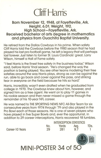 Cliff Harris Autographed Dallas Cowboys Mini Poster 34/50 Beckett 46085