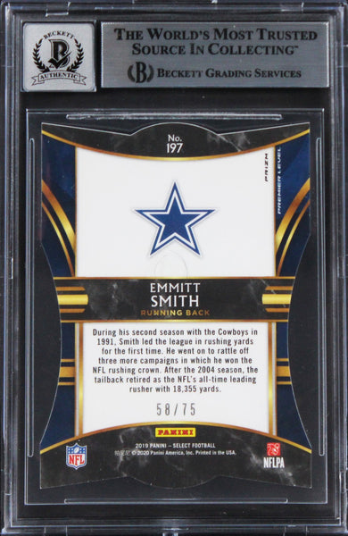 This Autographed Auto Graded Gem Mint 10! 2019 Select Prizm Purple #197 Card has been Personally Signed by Emmitt Smith of the Dallas Cowboys. This item is 100% Authentic, it comes slabbed and authenticated by Beckett Authentication Services. We conducted an autograph signing with Emmitt Smith where multiples of the same item were signed. While the photographs are representative of this item, the size, placement and strength of the signature may vary. Each item is hand signed, therefore, each autograph is unique. This item can be verified through BAS Slabbed.