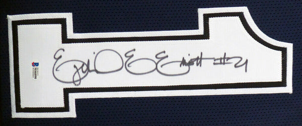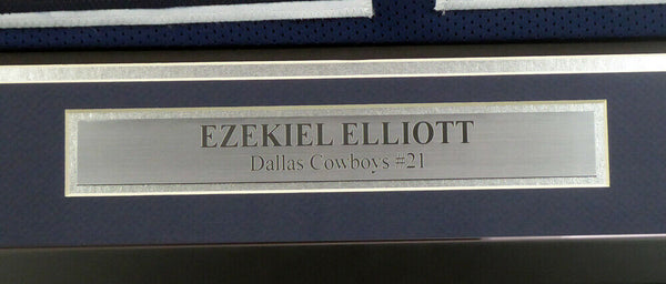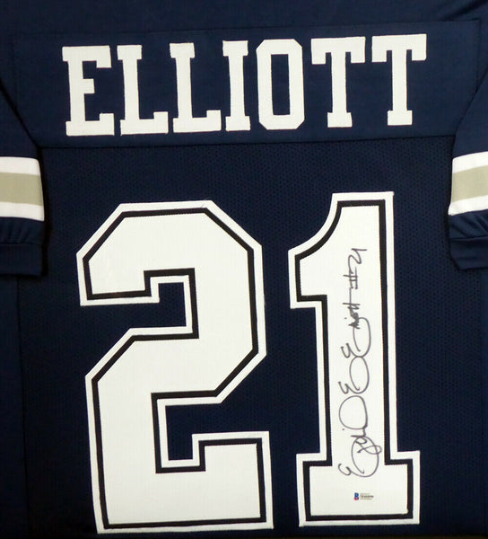 This is a Framed Jersey, approximately 31x36, that has been hand signed by Ezekiel Elliott. This is a custom jersey with no name brand. The approximate size is XL. It has nice sewn in name and numbers. It is authenticated by Beckett Authentication Services (BAS) and comes with their tamper-proof sticker and matching serial numbered certificate of authenticity.