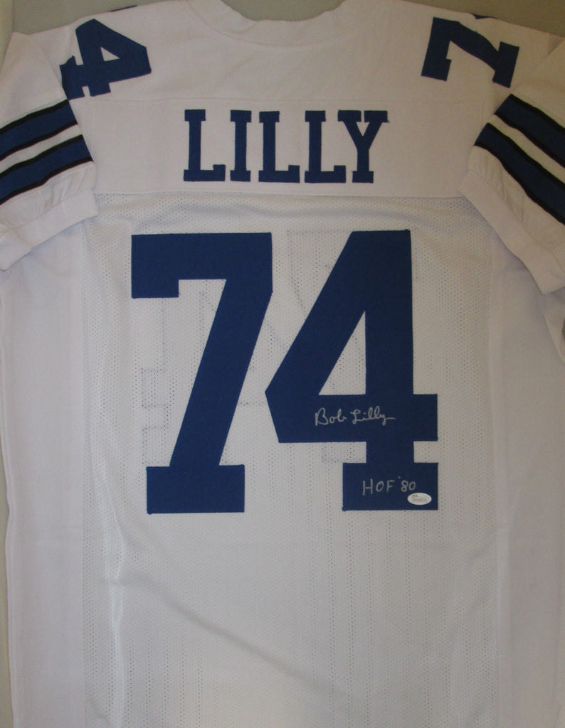 Custom Jersey hand signed by Dallas Cowboys Hall of Famer BOB LILLY. The signature is in Black Paint Pen with the inscription "HOF '80". This Item was signed at a public signing and would make a great addition to any COWBOYS collection! The jersey is size XL and all letters and numbers are sewn/stitched on. This item is guaranteed to be 100% authentic and will include a COA from JSA (James Spence Authentication) with matching serial numbers.