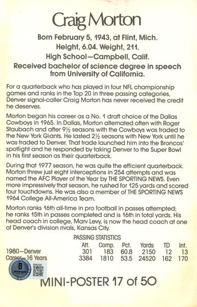 The number in the listing title is just an inventory sku for our records and is not the authentication number. This is a stock photo of the item that you will receive. This is a mini poster measuring 8.5" x 5.5" that was personally autographed by Craig Morton. Includes a certificate of authenticity from Beckett Authentication Services (BAS) and Denver Autographs.FREE SHIPPING within the USA on orders over $10!