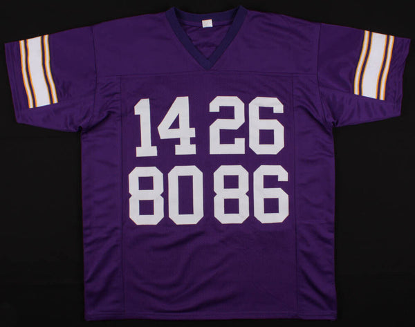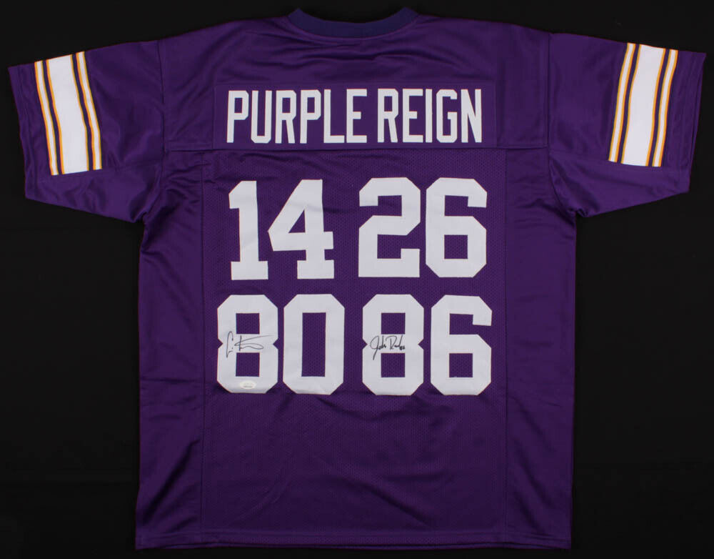 Custom on-field style jersey. Everything is sewn on, size XL. Hand-signed in black felt-tip pen by Cris Carter (HOF) and Jake Reed. The lot / autograph(s) includes an official James Spence Authentication (JSA) hologram and matching COA for authenticity purposes. The signing of this item was witnessed by JSA.Authentication: JSA COA