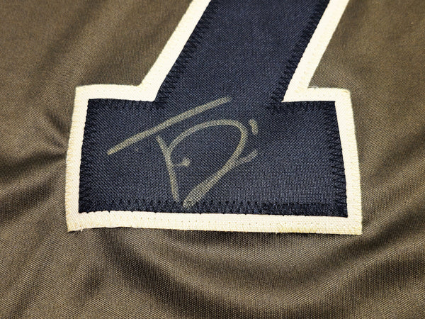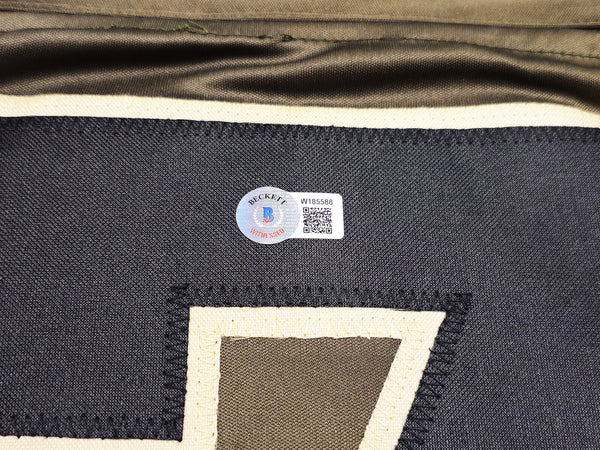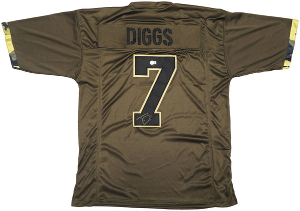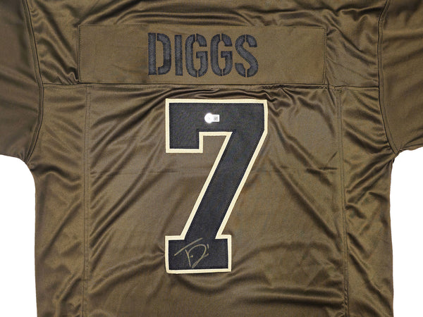 This is an Army Green Jersey that has been hand signed by Trevon Diggs. This is a custom jersey with no name brand. The approximate size is XL. It has nice sewn in name and numbers. This item has been witnessed and certified authentic by Beckett Authentication (BAS) and comes with their tamper-proof witness sticker.