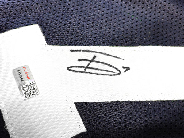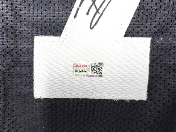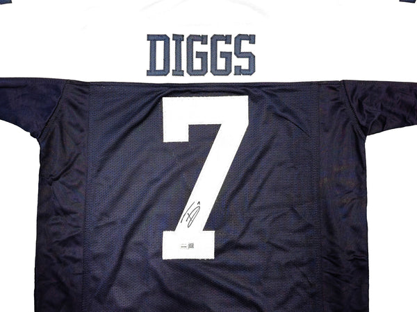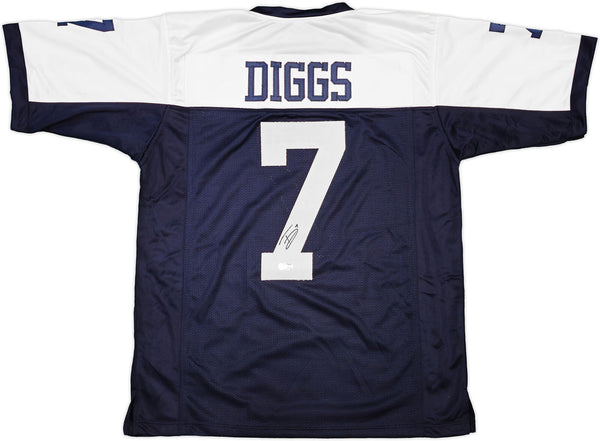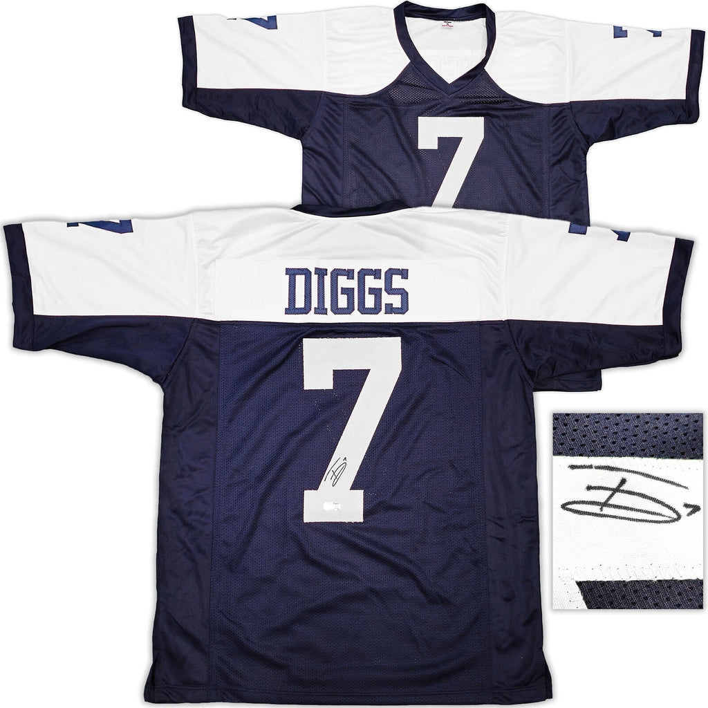 This is a Blue & White Jersey that has been hand signed by Trevon Diggs. This is a custom jersey with no name brand. The approximate size is XL. It has nice sewn in name and numbers. This item has been certified authentic by TriStar and comes with their tamper-proof sticker and matching certificate of authenticity.