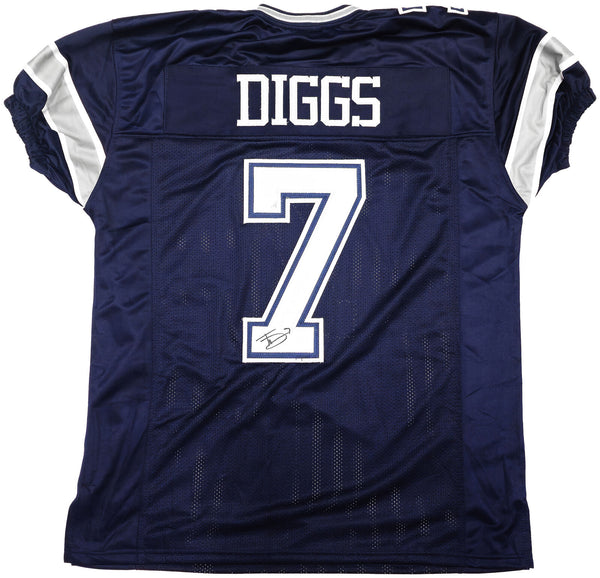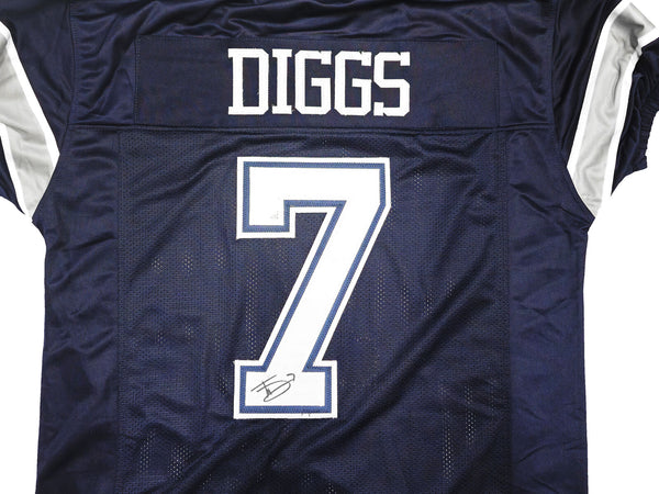 This is a Blue Jersey that has been hand signed by Trevon Diggs. This is a custom jersey with no name brand. The approximate size is XL. It has nice sewn in name and numbers. This item has been certified authentic by TriStar and comes with their tamper-proof sticker and matching certificate of authenticity.