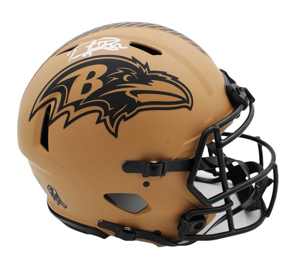 A Baltimore Ravens Speed Authentic Salute To Service 2 NFL Helmet hand signed by Derrick Henry. The item and signature are in excellent condition. Derrick Henry is an American professional football player, widely regarded as one of the most dominant running backs in the NFL. He has broken multiple records, including becoming the eighth player in NFL history to rush for over 2,000 yards in a season. He has earned multiple Pro Bowl selections and All-Pro honors. AUTHENTICATION: The item is accompanied by a Beckett Serial Numbered and Databased Hologram.