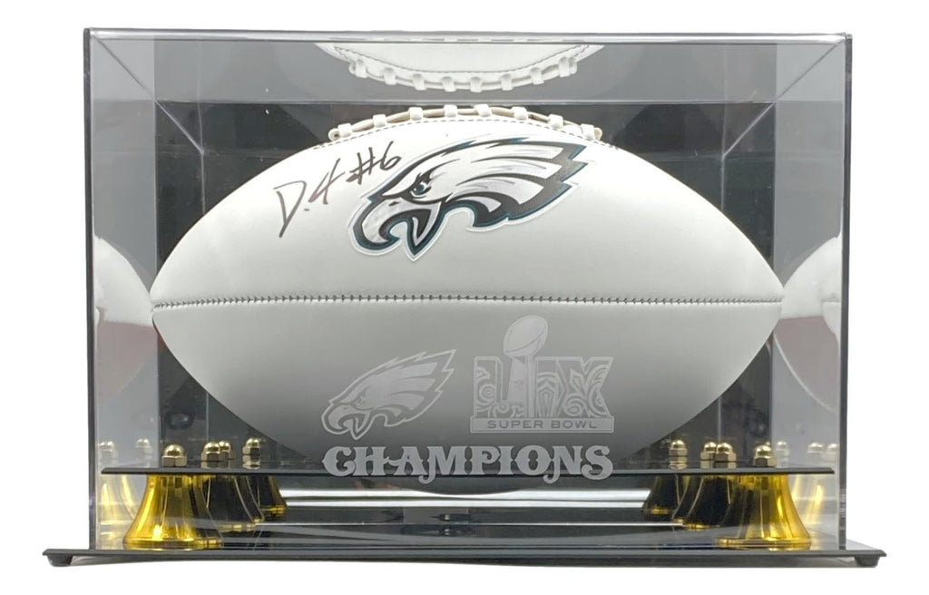 Featured is a Devonta Smith signed Philadelphia Eagles logo football. This ball has been hand signed by Smith and comes with the Fanatics hologram and certificate of authenticity. Included with this ball is a Super Bowl 59 deluxe acrylic display case. This ball would make a great addition to any sports memorabilia collection!. SPECIFICATIONS Autographed By: Devonta Smith Team: Philadelphia Eagles Sport: Football Authentication: Fanatics Authentic
