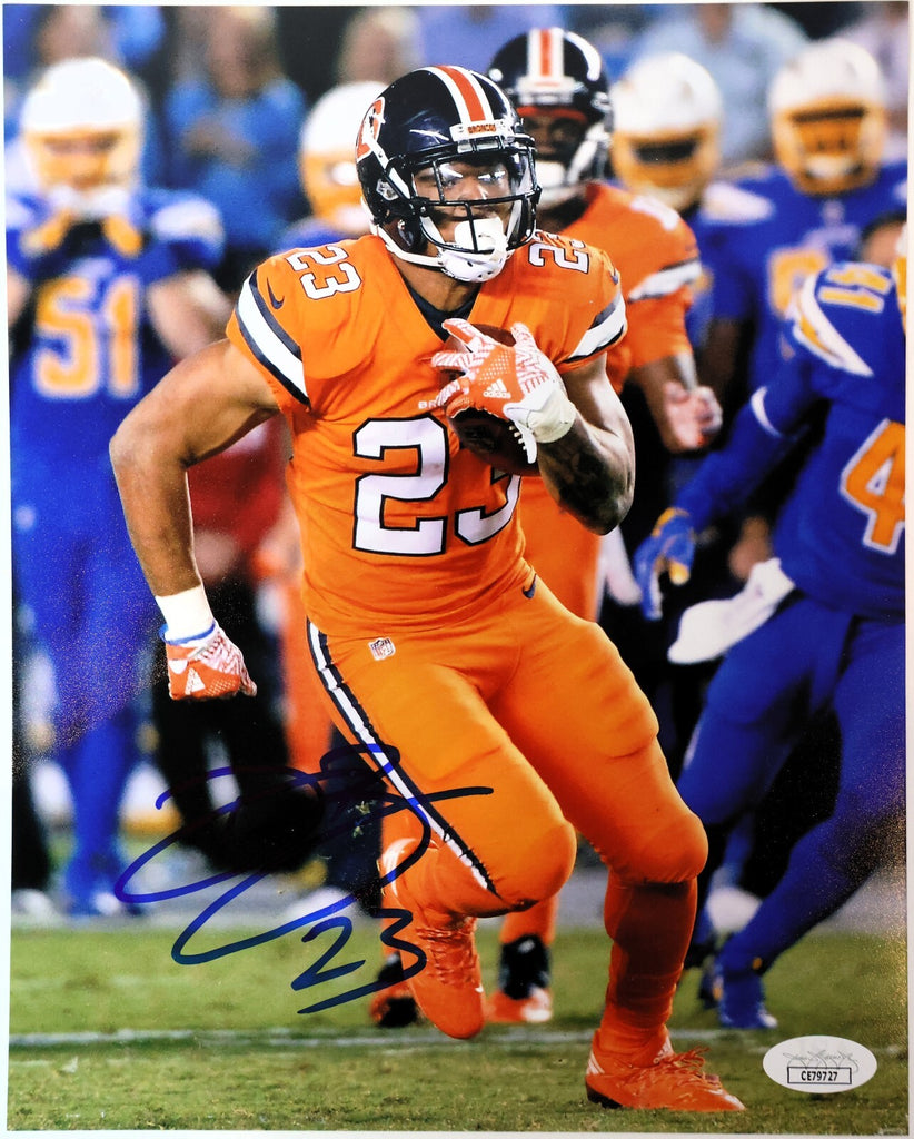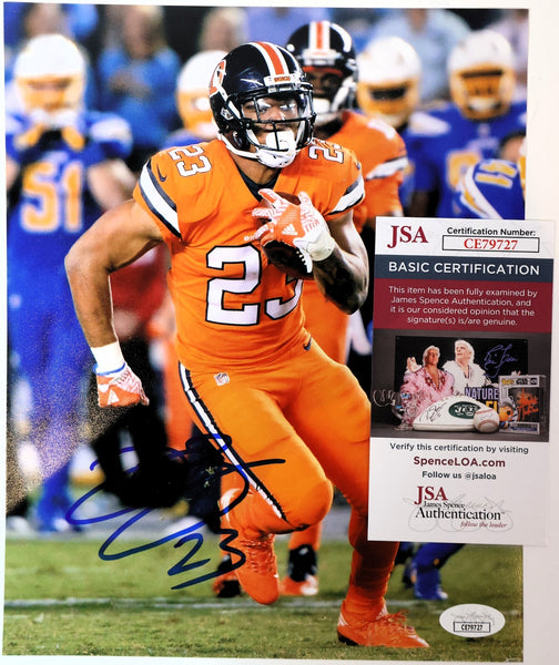 The product is an autographed 8x10 photo of Devontae Booker from the Denver Broncos. The signature is authenticated by James Spence Authentication (JSA), making it a valuable collectible for fans of football and the player. This original photo captures a moment in sports history, making it a unique and special item for any football memorabilia collector.