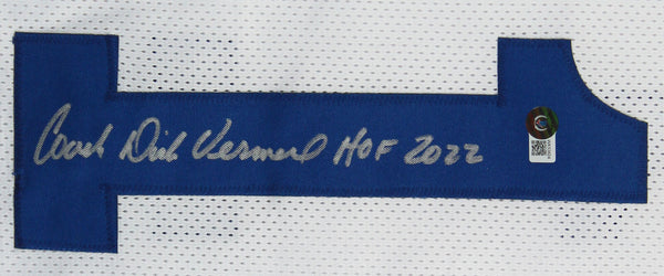 This Autographed Whtie Pro Style Jersey with the inscription of "HOF 2022" has been Personally Signed by Dick Vermeil of the St. Louis Rams. This item is 100% Authentic to include a hologram by Beckett Authentication Services. This item may come with the new Beckett Authentication hologram that has a scannable QR code rather than the traditional COA. If you would like to have a COA, you are welcome to reach out to Beckett for a printed certification once you receive your item. This is a BAS Witnessed Protection Program item which means a Beckett Authentication Service representative was present when this item was being signed. We conducted an autograph signing with Dick Vermeil where multiples of the same item were signed. While the photographs are representative of this item, the size, placement and strength of the signature may vary. Each item is hand signed, therefore, each autograph is unique. This item can be verified through BAS Witnessed. This is a X-Large sized, non-branded, custom-stitched Jersey.