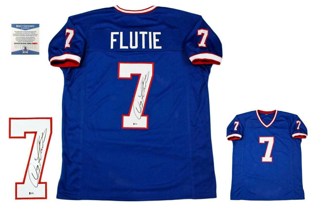 This signed item is brand new without tags or logos. This jersey is custom sewn in a size Large / XL. All the letters and numbers are sewn on! This item will make a great gift or a great addition to any collection at an AFFORDABLE PRICE! ATHLETE: Doug Flutie ITEM: Custom Sewn Jersey AUTHENTICATION: This item comes with a Beckett Certificate of Authenticity and serial #'ed hologram affixed to the item. To ensure authenticity, the hologram can be reviewed online. This process helps to ensure that the product purchased is authentic and eliminates any possibility of duplication or fraud. NOTE: All of our autographed jerseys are custom jerseys, unless otherwise noted. Our custom jerseys are NON-BRANDED, have NO logos, NO tags, NO patches, NO emblems. All letters and numbers are SEWN-ON. The non-branded jerseys are made specifically for the player(s) to sign, for collectible purposes.