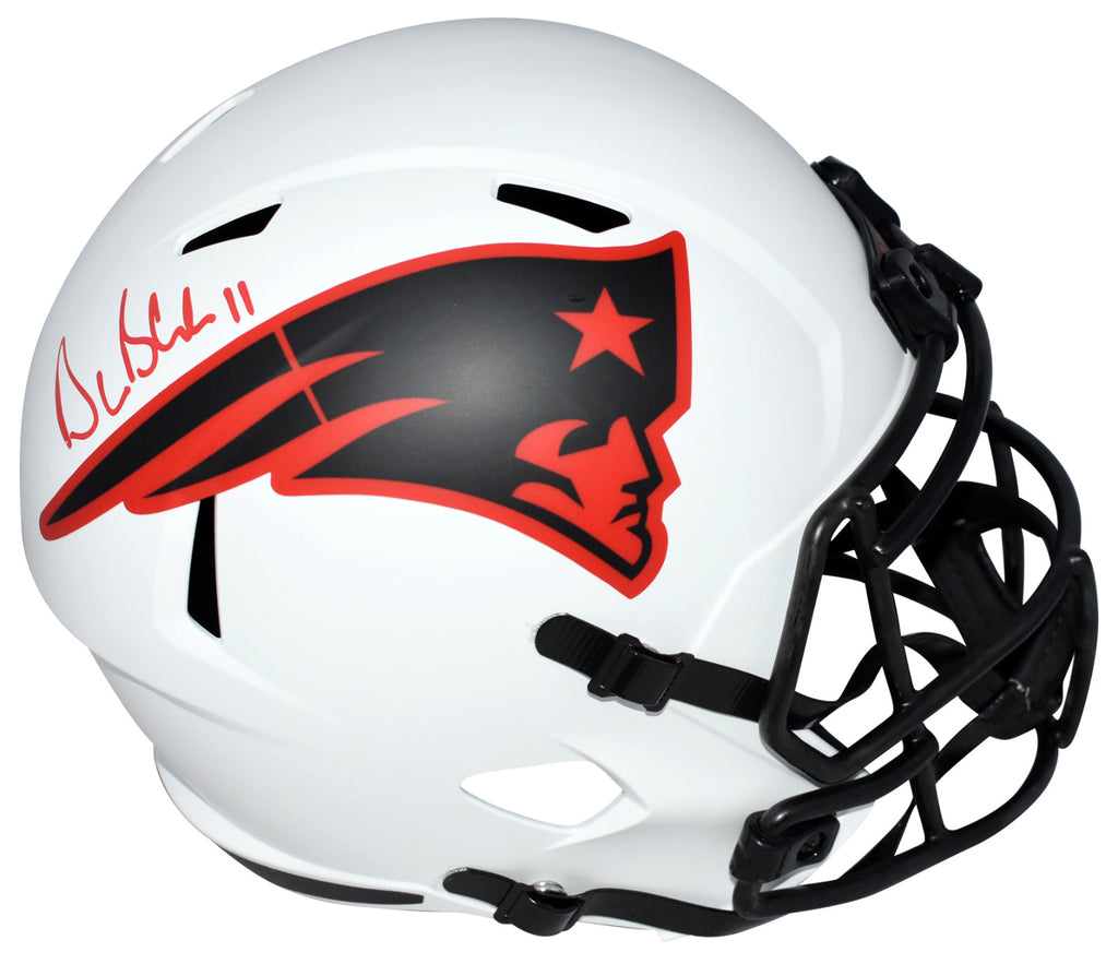 Drew Bledsoe, former star quarterback for the New England Patriots, has hand signed this Patriots Riddell Speed Lunar full-size replica helmet at a private signing. This item is authenticated by Beckett Authentication Services and was signed in the presence of one of their representatives. Their tamper-evident hologram featuring a QR code and serial number is on the item. The authenticity can be verified online by entering the serial number or scanning the QR code.Item pictured may not be the exact item you will receive. It will be similar quality, and we guarantee your satisfaction.