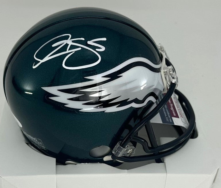 Riddell VSR4 Mini Helmet hand signed by Philadelphia Eagles Quarterback DONOVAN MCNABB. The signature is in White paint pen. This item was signed at a private signing and would make a great addition to any Eagles collection! This item is guaranteed to be 100% authentic and will include a COA from JSA authentication.