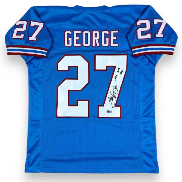 This signed item is brand new without tags or logos. This custom jersey is sewn in a size Large / XL. All the letters and numbers are sewn on! This item will make a great gift or a great addition to any collection at an AFFORDABLE PRICE! ATHLETE: Eddie George ITEM: Custom Sewn Jersey AUTHENTICATION: This item comes with a Beckett Authentication serial #'ed hologram affixed to the item. To ensure authenticity, the hologram can be reviewed online. This process helps to ensure that the product purchased is authentic and eliminates any possibility of duplication or fraud. NOTE: All of our autographed jerseys are custom jerseys, unless otherwise noted. Our custom jerseys are NON-BRANDED, have NO logos, NO tags, NO patches, NO emblems. All letters and numbers are SEWN-ON. The non-branded jerseys are made specifically for the player(s) to sign, for collectible purposes.